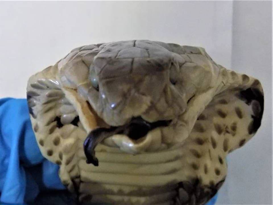 Внутри бутылки таможенники обнаружили настоящую заспиртованную кобру и корень растения. Экспертиза показала, что это моноклевая кобра, которая относится к охраняемым видам по международной конвенции СИТЕС.