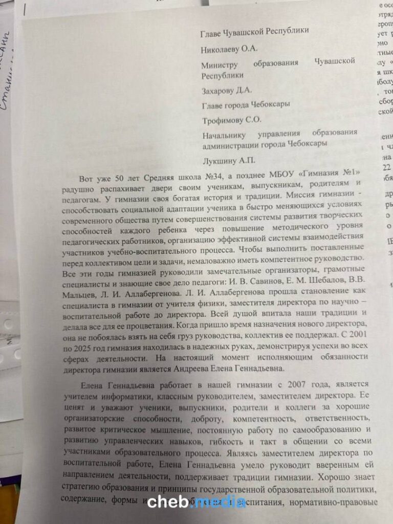 Коллектив и родители учеников гимназии №1 города Чебоксары выступили против возможного назначения Елены Сахаровой на пост директора. Соответствующие обращения направлены главе Чувашии, в региональное Минобразования и Администрацию президента России.
