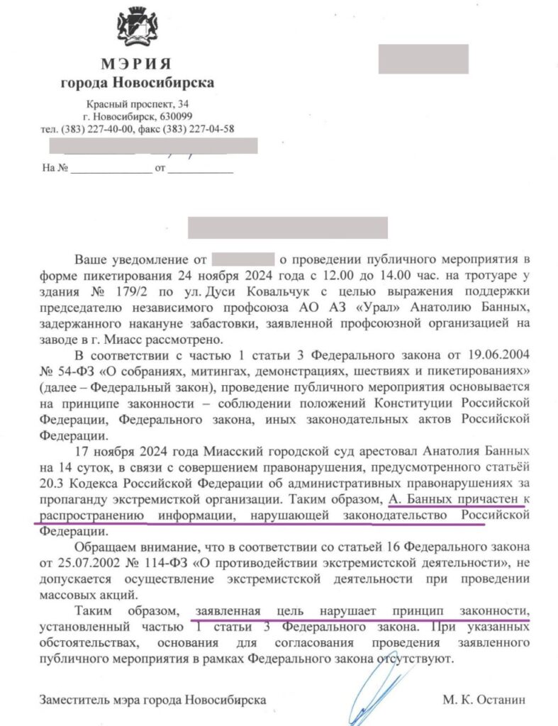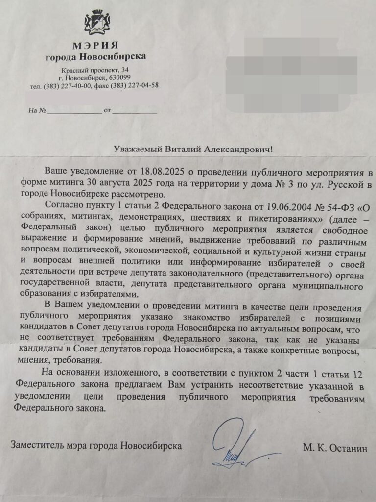 В документации за подписью вице-мэра Новосибирска Максима Останина обнаружены визуальные различия. Первым на это обратил внимание журналист Виталий Бочкарёв, получивший несколько отказов в проведении публичных мероприятий в Советском районе города.