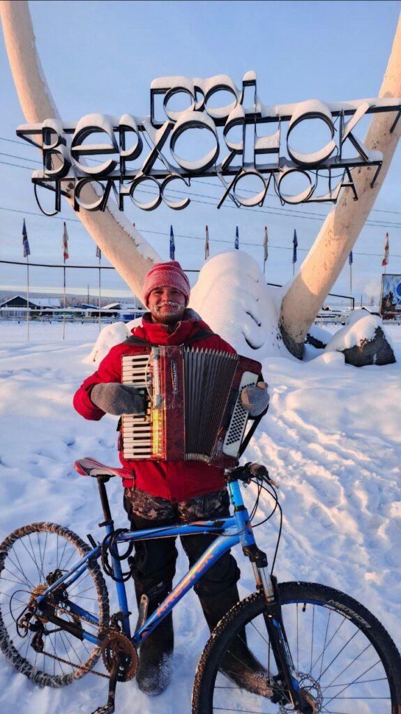 Пока большинство жителей страны кутается в шарфы, путешественник Клим Калужских доказывает, что для настоящего драйва не помеха даже экстремальные якутские морозы. Экстремал, прославившийся своим уникальным стилем передвижения — одновременной игрой на баяне и ездой на велосипеде — благополучно добрался до Верхоянска, одной из самых холодных точек планеты.