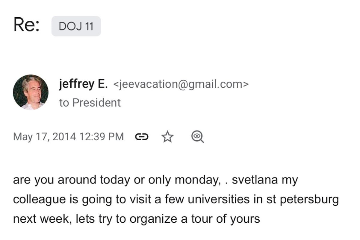 «Моя коллега Светлана собирается посетить несколько университетов в Санкт-Петербурге на следующей неделе. Давай организуем тур по твоему», — написал Эпштейн, имея в виду Смольный.