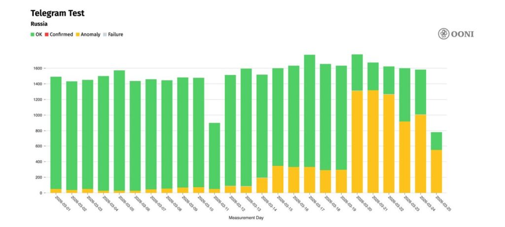 По данным мониторинговых сервисов OONI Explorer и главы «Общества защиты интернета» Михаила Климарева, 25 марта 2026 года уровень блокировок мессенджера вновь достиг критических значений. После короткого периода 23–24 марта, когда из-за технических сбоев в системе фильтрации трафика Роскомнадзора (ТСПУ) доступность сервиса поднималась до 40–50%, сегодня зафиксирован новый обвал. На данный момент лишь около 29% попыток подключения проходят успешно без использования средств обхода блокировок.