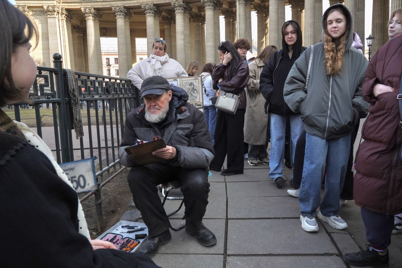 Вчера у Казанского собора к петербургскому уличному художнику выстроилась очередь из примерно 30 человек, рассказал корреспондент «Бумаги». В комментариях к рилсам с художником в инстаграме пользователи рассказали, что художника зовут «дядя Володя», он обычно появляется у собора около двух часов дня.