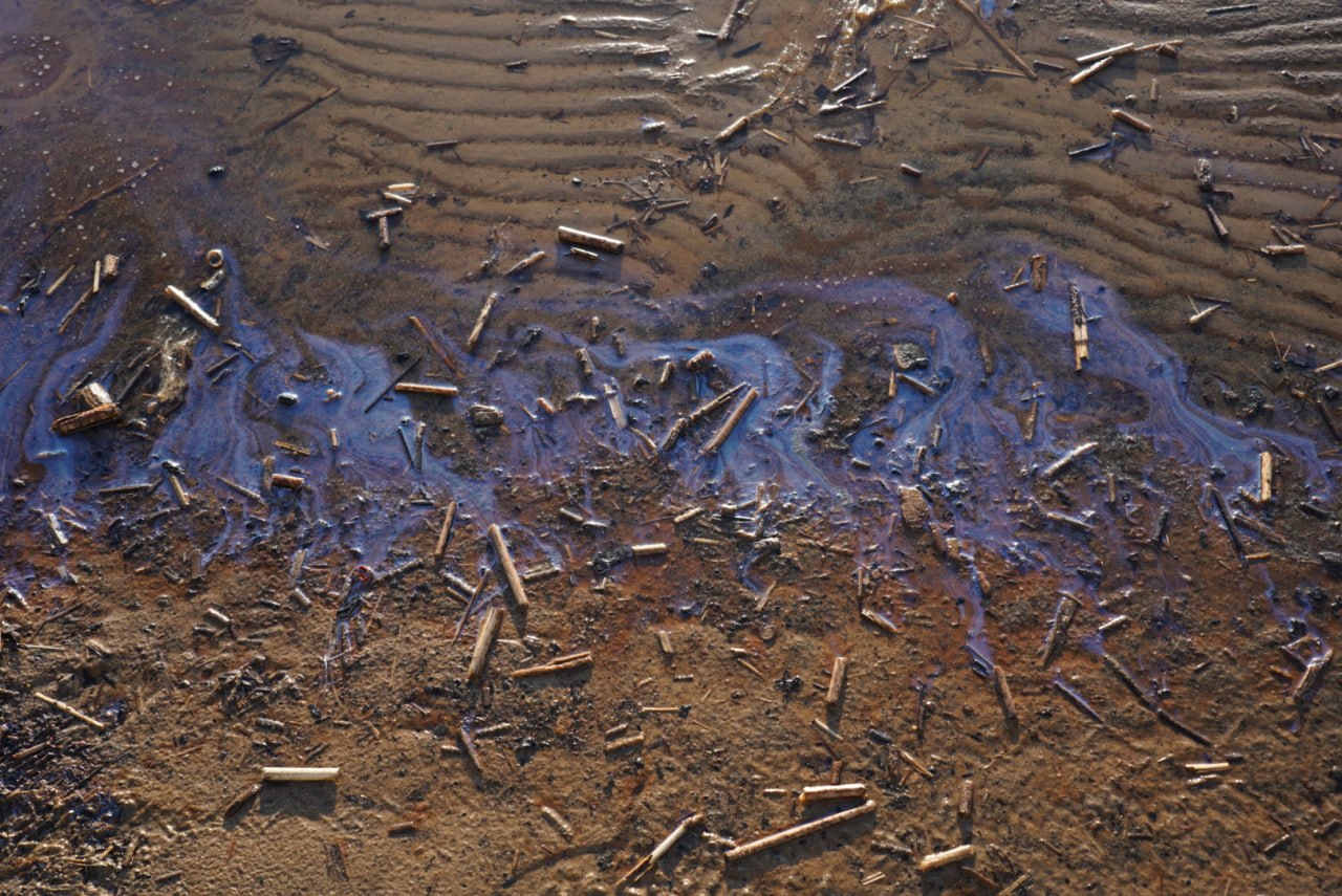 — На снимках видны характерные полосы вдоль линии прибоя, а также радужный отлив на воде — это типичный признак тонкой пленки нефтепродуктов. Такое возникает при выбросе тяжелых фракций топлива, смешанных с органикой и илом. Просто ил и сезонная органика обычно не дают такого жирного блеска и радужной пленки, как на фото, — заметила Морозова.